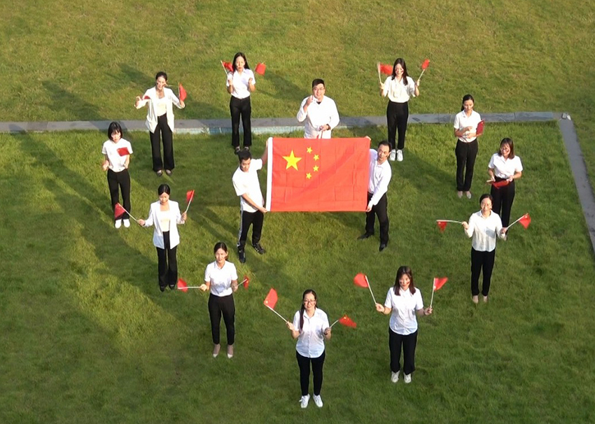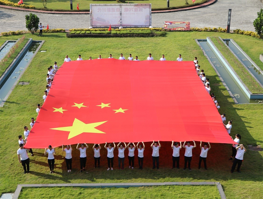 手持五星红旗,拼成方阵,取纵横经纬之意,抒全国各地的金科人团结合作,上下一心,共同祝愿祖国更加美好的赤子之情。