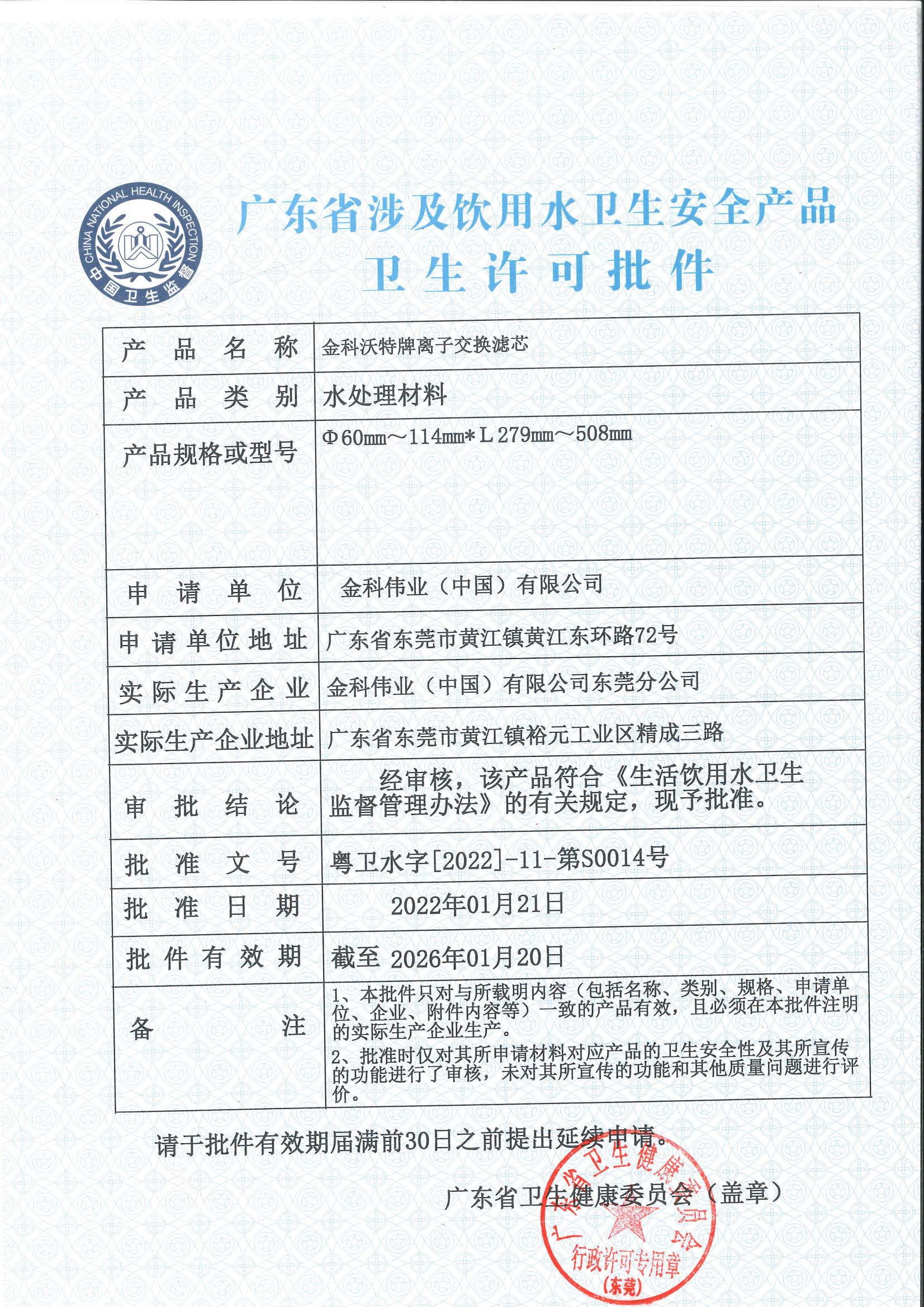 离子交换滤芯卫生许可批件